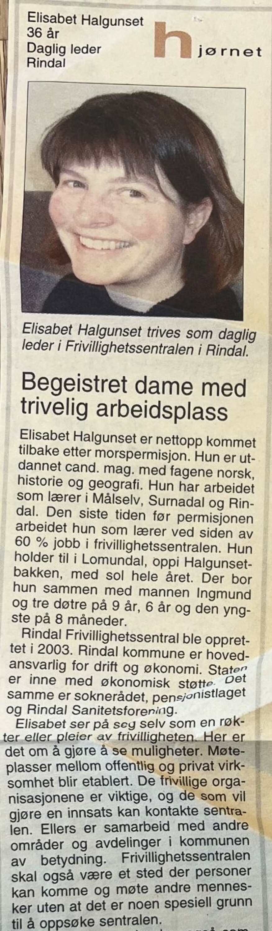 Elisabet Halgunset vart tilsett som dagleg leiar for Rindal frivillighetssentral, i 60% stilling. Ho fortel at ho hadde som utgangspunkt at ho alltid har vore eit organisasjonsmenneske, og var oppflaska med engasjement og frivillig arbeid. I 2003 var ho småbarnsmor, evig vikar på skulen, og ho sakna tida i bygdeungdomslaget og frivillig engasjement på alle vis.