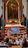 Trusopplærar Elsa Jensvold leda preika om sauen som gjekk seg vill. Sjølv hadde ho hatt med seg fire leikesauer til kyrkja, men to hadde tulla seg bort. Dei måtte ungane hjelpe til og finne. Dei fann den eine bak altertavla. Den andre fann dei langt bak i kyrkja, så det gjekk godt, takka vere gode gjetarar som ville ha med seg alle sauene!