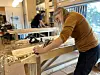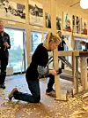 Bodil Børset, som er avdelingsleder ved Rindal skimuseum, er selv deltaker på kurset. Hun har gjort om kaféen på skimuséet til skiverksted for anledningen. Hun synes det er godt å kunne jobbe inne i varmen, med det sure høstværet som er akkurat nå. Det passer godt at skimuséets lokaler er et låvebygg, med tregulv. De har lagt plater på gulvet for å beskytte det, og har montert fast arbeidsbenker som Aslaksby har med seg. Med denne løsningen kan nesten et hvilket som helst lokale gjøres om til midlertidig verksted. Her på skimuséet er det bare å koste opp høvelsponen når kurset er ferdig, så blir det kafé igjen. Men en del av arbeidet, slik som saging, foregår på den opprinnelige låven i bygget.