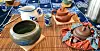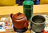 Vi fekk sjå og lukte på "tekake" - ikkje kvinneforeningskake, men ekte tekake frå Yunnan, Kina. Så fekk vi tepause for å smake på ekte grøn te, oppkvikkande, men litt tam.