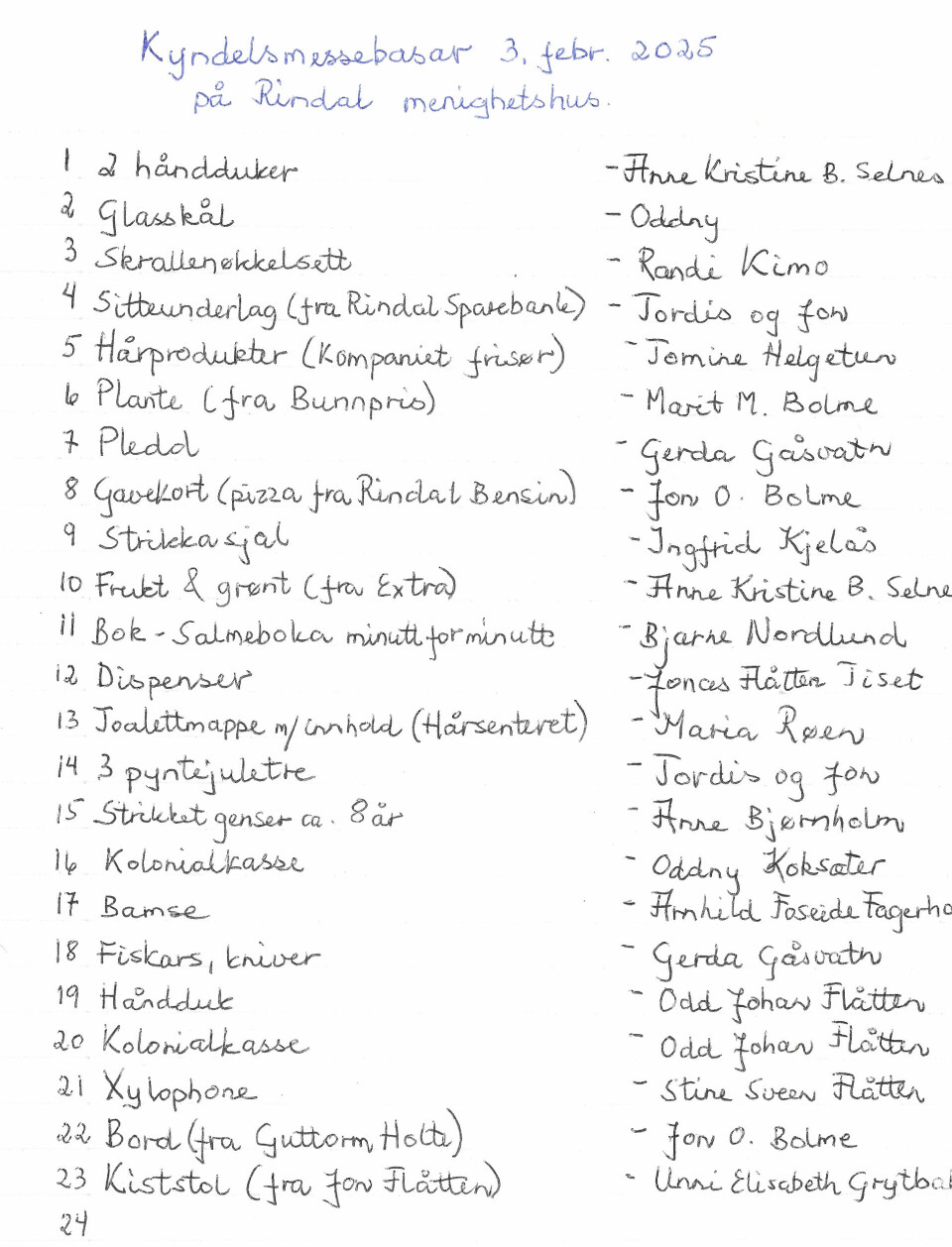Mandag kveld gjekk årets Kyndelsmessbasar av stabelen i Rindal med åresalg og gode tilbud frå kjøkkenet der Inger og Brit hadde ansvaret. Kvelden vart avslutta med stor trekning på det store og varierte gevinstbordet.
