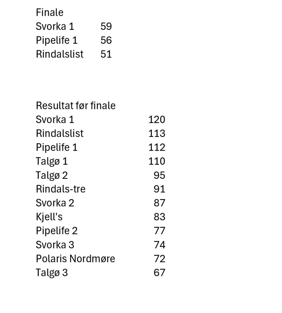 Det var til slutt Svorka sitt 1.lag som gikk seierende ut av finaleskytingen i årets Bedriftscup i Leirdueskyting etter finaleskytingen torsdag kveld. Pipelife sitt førstelag ble nummer to, og Rindalslist tok tredjeplassen. Svorka 1 var også klart best etter de innledende omgangene, mens Rindalslist, Pipelife 1 og Talgø var de tre neste på listen. Det ble til slutt Pipelife1 og Rindalslist som tok de to siste plassene i finaleomgangen.