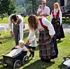Storebror trilla barnevogna med dåpsbarnet i åpningsprosesjonen.Foto: Ole Trygve Foseide