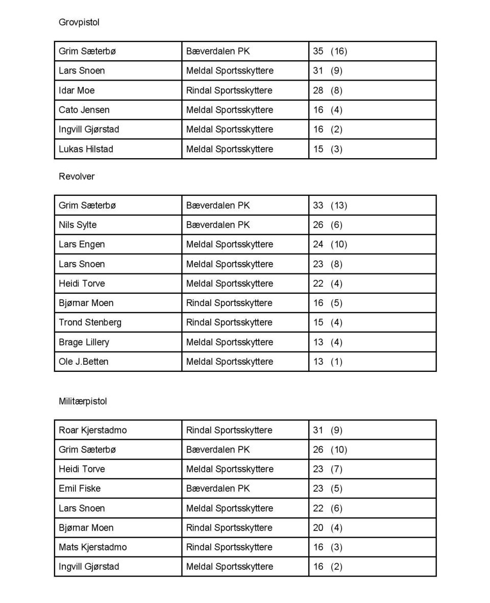 Grim Sæterbø vant tre av klassene. Finpistol, grovpistol og revolver. I tillegg tok han en andreplass i militærpistol. Klassen for militærpistol ble vunnet av Roar Kjerstadmo fra Rindal Sportsskyttere.