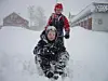 Godt gammeldags rindalsvintervær, 24. februar 2004. På vei hjem fra skolen på spark: Anders Ranheim (sittende) og Eirik Kjønsø Solvik.