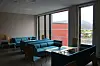 Grønne og brune vegger og massiv tre går igjen i hele bygget